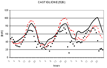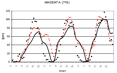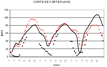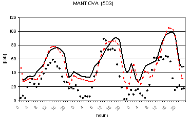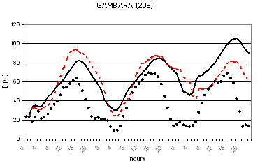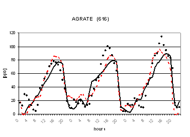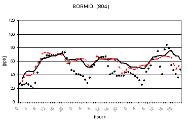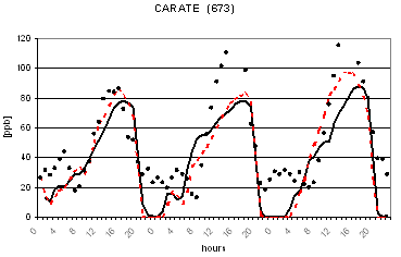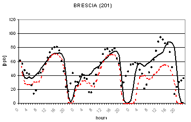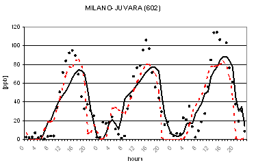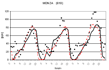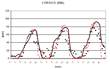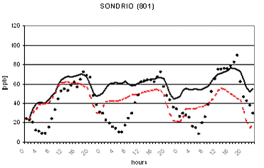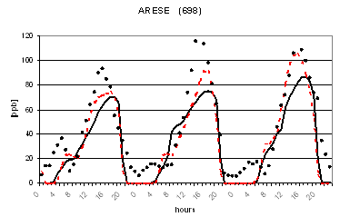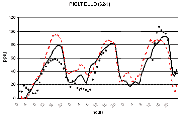 Al fine di verificare la capacità dei due modelli di riprodurre le concentrazioni osservate nella successiva figura 2 viene riportato il confronto tra le concentrazioni osservate e calcolate di O3 in alcune postazioni di misura. L'analisi di tale figura evidenzia un buon accordo tra le concentrazioni osservate e calcolate ed un comportamento analogo dei due codici. Gli andamenti giornalieri di ozono risultano infatti ben riprodotti con variazioni dell'ordine di qualche punto percentuale ad eccezione per alcune situazioni ove si registrano variazioni maggiori dell'ordine del 30-40%. I più elevati valori notturni previsti per alcune stazioni alpine (Sondrio e Bormio) e semi-rurali (Corte de Cortesi e Gambara) sono probabilmente dovuti sia a sottostime delle emissioni (in particolare da traffico) che alla ben nota difficoltà nel confrontare valori puntuali osservati nelle postazioni e spesso dovuti a fattori difficilmente predicibili con stime modellistiche relative a celle computazionali di dimensioni dell'ordine di qualche chilometro (nel caso in esame di 4 km).