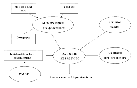 Partendo dai dati di ingresso (meteorologia, emissioni, concentrazioni iniziali ed al contorno) è quindi possibile utilizzare i codici CALGRID (Yamartino et al., 1992) e STEM-FCM per simulare il trasporto e le trasformazioni chimico-fisiche degli inquinanti presenti all'interno del dominio di calcolo. L'interfaccia FCM (Flexible Chemical Mechanism) (Kumar et al., 1995), messa a punto da CRB, è stata utilizzata per implementare nel modello STEM diversi meccanismi chimici tra i quali il meccanismo SAPRC-90 (Carter, 1990) che è quello implementato nel codice CALGRID.