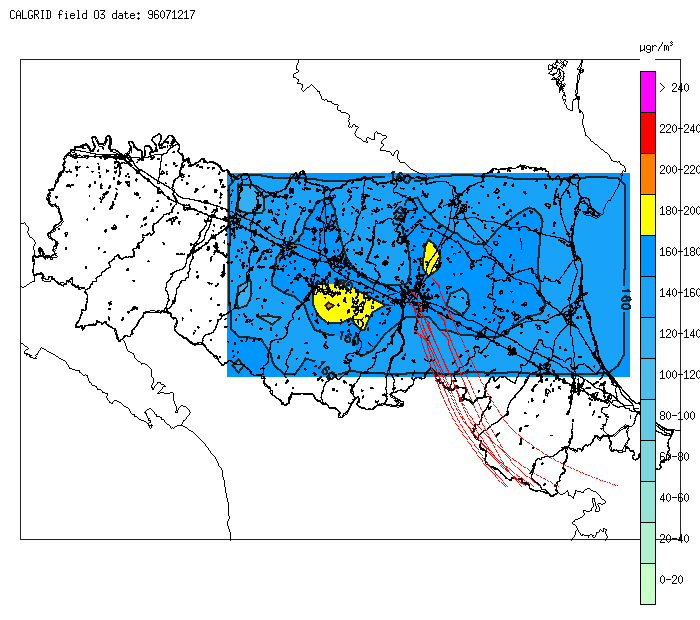 Nello studio dell'inquinamento da ozono e degli inquinanti fotochimici in generale, occorre considerare che una porzione significativa di questi inquinanti può essere trasportata per decine o centinaia di km in alcune ore. Per la simulazione modellistica della qualità dell'aria si è quindi predisposta in primo luogo una descrizione dei moti atmosferici sull'intero bacino padano. Il preprocessore meteorologico CALMET (Scire et al. 1990) è stato implementato utilizzando come dati di ingresso i dati osservati provenienti dalle stazioni SYNOP e locali di SMR, ed i radiosondaggi di S. Pietro Capofiume, Milano Linate e Udine. Questi campi sono disponibili quotidianamente sul sito www.smr.arpa.emr.it nella sezione "dati rilevati". La metodologia applicata è illustrata con maggiore dettaglio in Deserti et al. 1999.