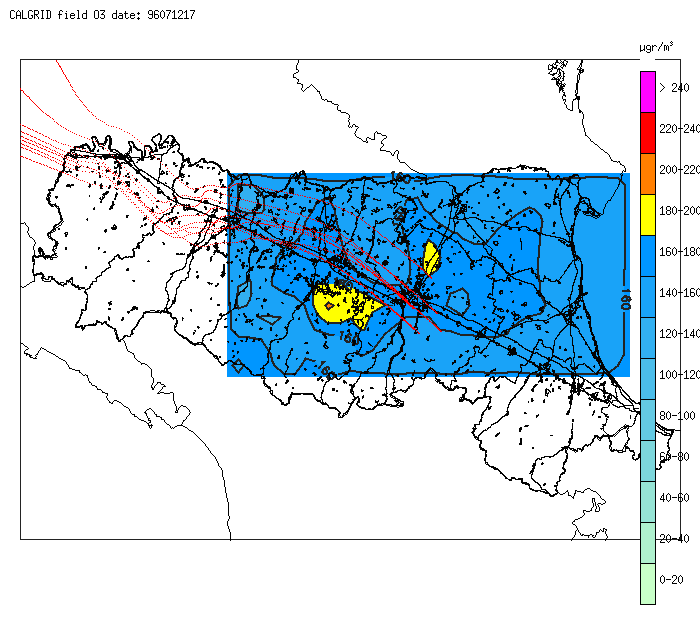 Le simulazioni sono state condotte utilizzando il modello fotochimico euleriano a griglia CALGRID (Yamartino, 1992). Le concentrazioni iniziali ed al contorno sono state calcolate con un modello semi - empirico basato sui dati sperimentali al suolo ed in quota disponibili nell'ambito della campagna MOTAP96.