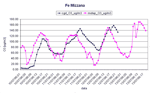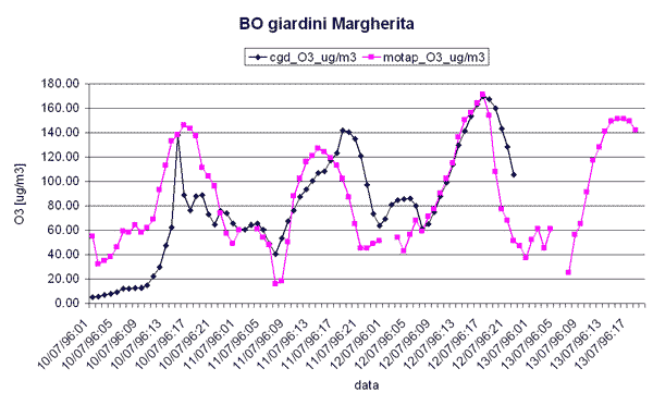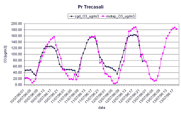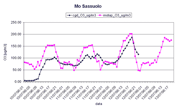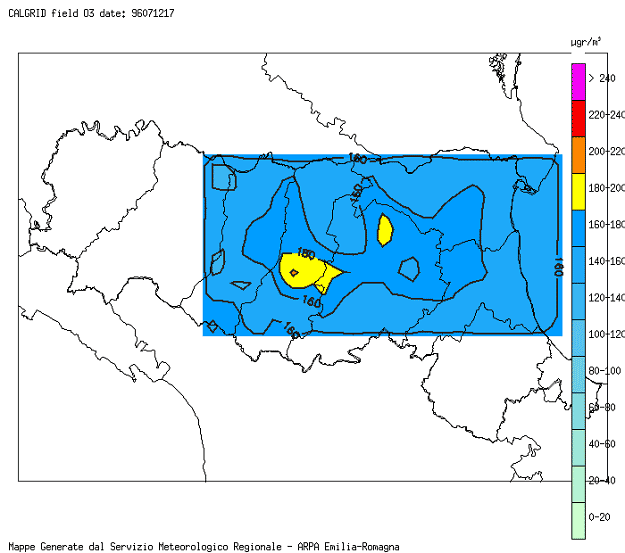 Il confronto tra la concentrazione media oraria di ozono osservata presso diverse stazioni di rilevamento dell'Emilia - Romagna e la corrispondente concentrazione simulata nei giorni 11 e 12 luglio 1996 utilizzando il modello CALGRID mostra un buon accordo tra la concentrazione di ozono simulata dal modello e la concentrazione osservata.