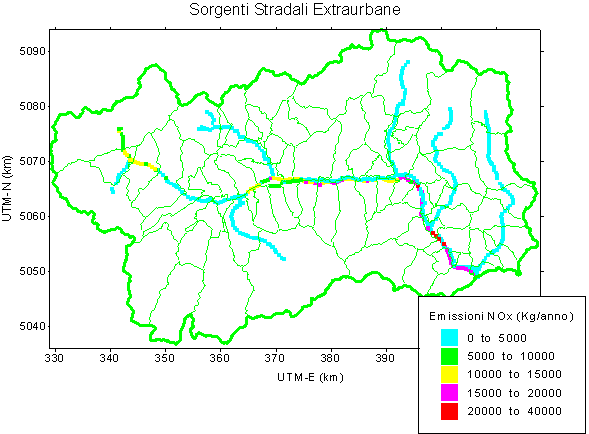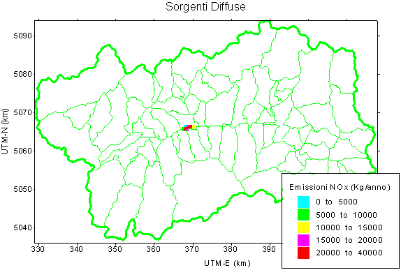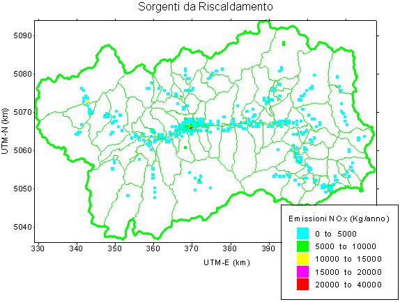 L'insieme delle emissioni considerate è stato ricostruito sulla base del Sistema Informativo Territoriale delle Sorgenti di Combustione della Regione Valle d'Aosta. Sono state fornite le emissioni di solfati ed ossidi di azoto, dovute al traffico veicolare ed al riscaldamento civile nella regione relative all'anno 1993 (Agnesod, 1996). La ricostruzione è stata effettuata su un grigliato regolare di passo 500 metri a copertura dell'intera regione, suddividendo tra sorgenti lineari (traffico autostradale e su strade statali), sorgenti diffuse (traffico urbano, piccole industrie), e sorgenti areali (riscaldamento abitazioni civili e utilizzo acqua calda). Nel complesso, i dati di emissione sono relativi a 525 sorgenti lineari, di cui 97 autostradali e 428 statali, 15 sorgenti diffuse e 376 sorgenti di riscaldamento, per un totale di 916 sorgenti sia di solfati che di ossidi d'azoto. Le figure mostrano sia il posizionamento che l'emissione annua di NOx per tutte le tipologie di sorgente considerate.