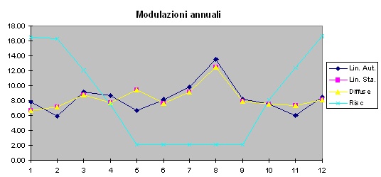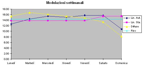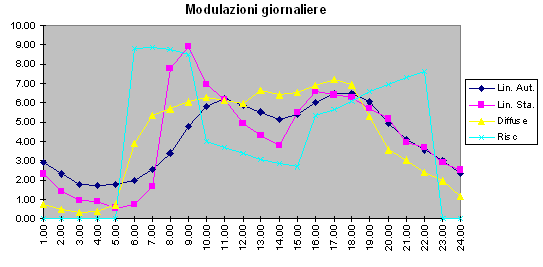 I dati di emissione su base annuale sono stati quindi disaggregati temporalmente su base oraria, utilizzando tre differenti fattori di modulazione, differenti per ciascuna tipologia di sorgente, che riproducono i tipici cicli giornaliero, settimanale e annuale. Le figure mostrano l'andamento di questi fattori.