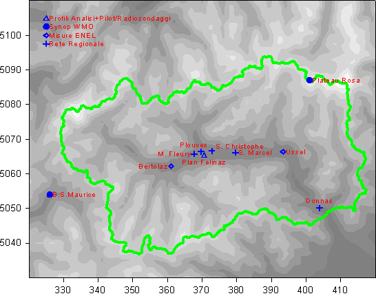 Per fare fronte a queste esigenze, la rete utilizzata è costituita da misure al suolo sia in fondovalle che a quote più elevate, da profili verticali ottenuti mediante radiosondaggi e palloni PILOT e da profili di analisi a scala sinottica provenienti dal centro di Reading.