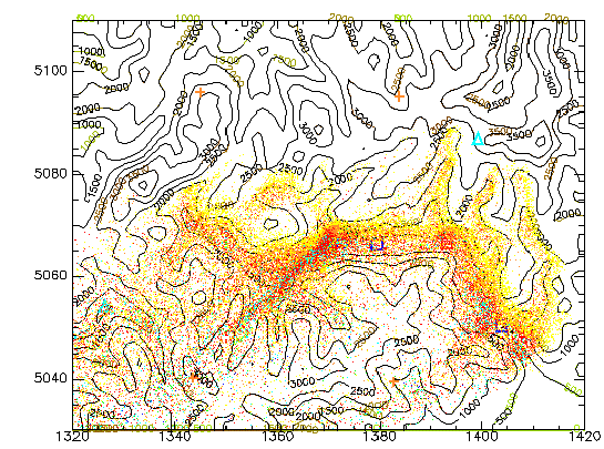 In figura è visualizzato un esempio del pennacchio di particelle che descrive il complesso delle sorgenti emissive considerate in queste simulazioni. Le particelle sono colorate secondo la loro distanza dal suolo; la parte gialla rappresenta la porzione del pennacchio più vicina al suolo mentro la parte arancione e rossa quella più lontana