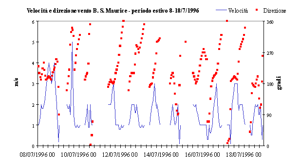 Stazioni esterne alla valle, pur mettendo in evidenza un andamento qualitativamente simile a quelle interne, mostrano però aspetti locali che possono essere molto differenti, dimostrando l'estrema disomogeneità orizzontale presente nei primi strati atmosferici in un sito così complesso. La figura illustra l'andamento dei dati orari estivi per la stazione di B.S.Maurice, ad ovest della valle principale ed estranea ad essa.
