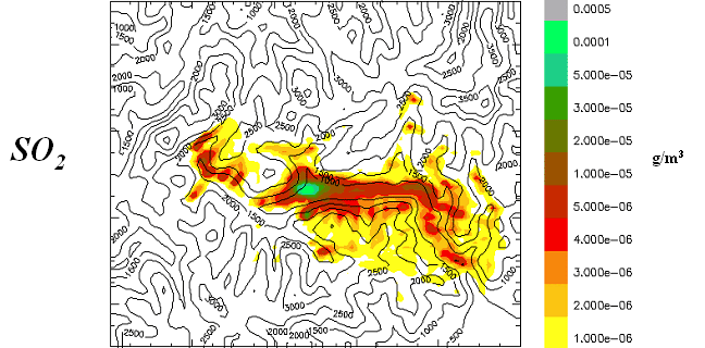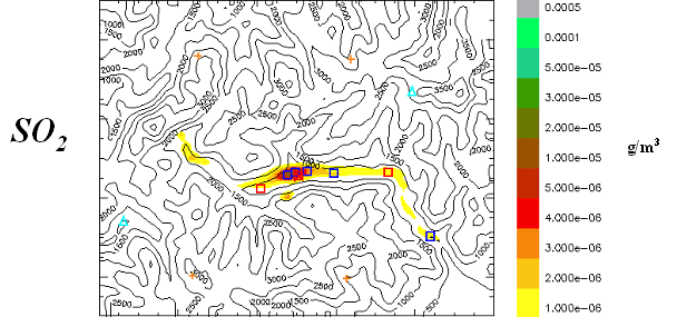 Sono stati ricostruiti i campi di concentrazione al suolo orari sia di SO2 che di NOx per entrambi i periodi, estivo ed invernale, presi in considerazione. Da questi sono quindi stati calcolati i campi di concentrazione media giornaliera e le concentrazioni medie su tutto il periodo. Le mappe che si ottengono suggeriscono un'informazione di scenario riassuntiva, visuale ed immediata, delle principali regioni d'impatto delle varie sorgenti, fornendo una stima delle aree d'influenza per ciascuna di queste ed eventuali regioni di sovrapposizione. La rappresentatività climatica dei periodi scelti come campione, può suggerire inoltre una estrapolazione di tipo qualitativo su scala stagionale dei campi di concentrazione media calcolati. Le figure rappresentano i campi di concentrazione al suolo medie per i periodi estivi ed invernali, relativi ai due inquinanti presi in considerazione.