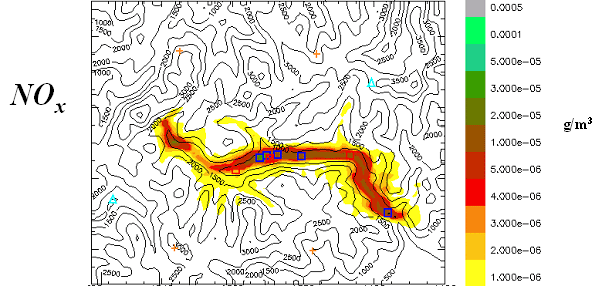 In estate, le emissione di maggiore rilevanza riguardano soprattutto il traffico veicolare, che costituiscono il principale contributo di NOx, con massimi dell'ordine di 50 mg/m3 comunque inferiori rispetto al caso invernale. Minore importanza rivestono invece le sorgenti da riscaldamento, che determinano un evidente minore impatto nelle concentrazioni al suolo di SO2. Sia nel caso estivo che in quello invernale, è comunque evidente il confinamento orografico dei campi di concentrazione sia nella vallata principale che in quelle secondarie.