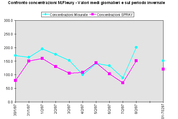 E' stato realizzato un confronto puntuale tra le concentrazioni misurate dai recettori e quelle simulate dal modello nelle stesse posizioni. Il confronto è generalmente buono, anche tenendo conto delle diverse incertezze introdotte nel sistema modellistico, tra le quali un ruolo importante gioca la definizione di termini di sorgente dedotti da stime statistiche, in grado di riprodurre le caratteristiche generali delle emissioni ma non i reali dettagli temporali. Sono stati verificati gli andamenti orari, le medie giornaliere e la media complessiva dei periodi simulati.