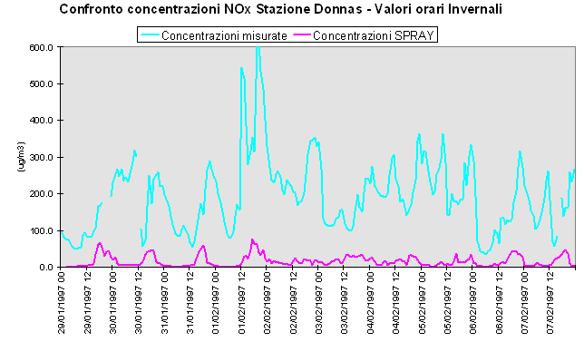 L'esempio raffigura l'andamento comparato delle concentrazioni al suolo di NOx nelle stazione di M.Fleury, posta al centro della valle principale e Donnas, all'ingresso della valle verso la Pianura Padana. Per quanto riguarda la stazione di M.Fleury, l'ordine di grandezza delle concentrazioni risulta ben simulato, sia per i valori orari (sopra) che per quelli medi giornalieri e di periodo (sotto). Anche le modulazioni dei valori giornalieri e, in diverse giornate, di quelli orari, seguono andamenti concordi. Nella stazione di Donnas, sono invece evidenti sottostime da parte del modello, giustificabili dal non aver tenuto conto, nei termini di sorgente simulati, dell'ingresso di inquinanti provenienti dal contorno inferiore, provenienti dalla Pianura Padana.