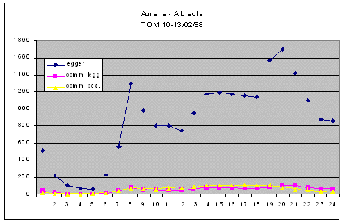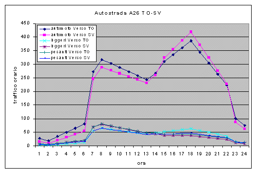 Le figure illustrano i dati di TOM misurati dalla provincia di Savona mediante un sistema a telecamera posizionato sulla SS1 presso Albisola e stimati sull'autostrada A26, durante il periodo 10-13/2/1998 preso in considerazione.