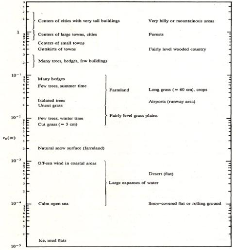 | Rugosità del terreno (roughness; z0) | Estrapolate dal profilo dell'intensità del vento nello strato superficiale, in modo da approssimare la relazione: |
