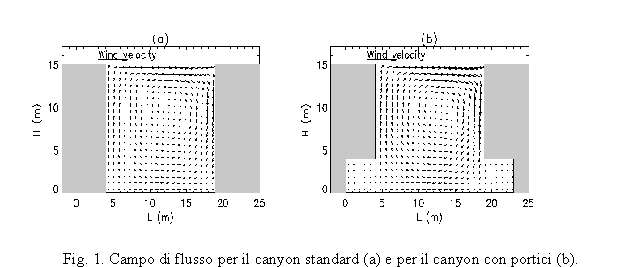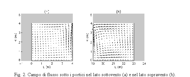 I vortici secondari che si creano all'interno dei portici nel caso (b) sono rappresentati con maggior dettaglio in figura 2, dove l'andamento è antiorario e le velocità del vento sono minori rispetto a quelle del vortice principale.