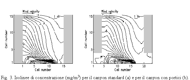 Si può notare che le distribuzioni di concentrazione ottenute differiscono da quelle di Lanzani (1995). A differenza dei risultati di Lanzani (1995), nei nostri i valori minimi di concentrazione si osservano nel lato sopravento (winward) del canyon, come conseguenza dell'azione della turbolenza che svuota la parte centrale del canyon e impedisce l'intrappolamento nel vortice centrale.